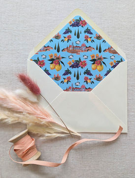 Capture the essence of Tuscany with this enchanting envelope liner. Featuring the iconic Florence skyline, sun-kissed lemons, and graceful cypress trees, this design transports you to the heart of Italy. Grapes and delicate flowers complete this idyllic pattern, perfect for adding a touch of romantic elegance to your Tuscan wedding or creating an authentic ambiance for any Italy-themed celebration.