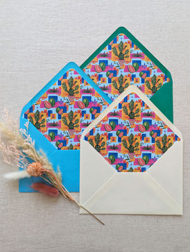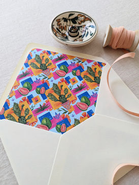 This Latin-inspired envelope liner will bring a burst of colour and life to your celebration. A vibrant cactus stands tall amidst a profusion of juicy guava fruit, all bathed in the warm hues of a Mexican sunset. Add a touch of exotic flair to your invitations with this stunning envelope liner.